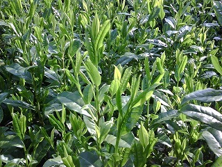 写真は茶業会館裏の協同組合茶畑の新芽。てん茶となる覆い下園の写真です。