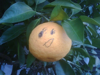 恒例の愛犬の散歩の途中、何か違和感を覚えて通りにある一軒の庭先のはっさくに目をやると、こんなのがありました。