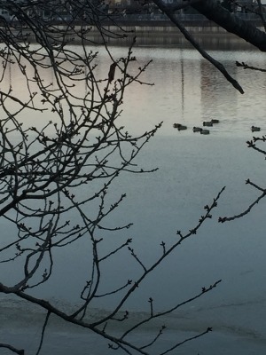 いつもは浅瀬にあそぶカモたちも、沖合いに避難しています。